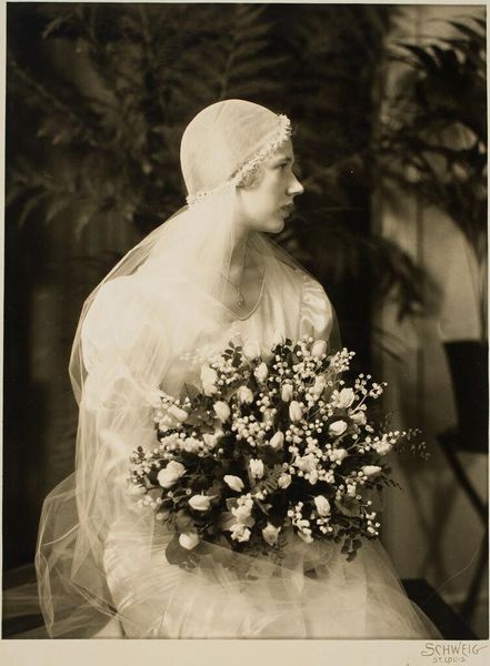 This photograph, currently held at the Harvard Art Museums, was made by Paul Gittings using traditional photographic materials and processes. The photographic print presents a young girl adorned with flowers, standing beside a large bouquet. The artist, in controlling the exposure and development of the film, has captured a range of tones, from the deep blacks of the background to the soft greys of the girl's dress and the luminous whites of the flowers. Consider the work that has gone into the production of this image, from the labor involved in growing the flowers to the technical skill required to produce the photographic print. Traditional photography is a chemical process, which depends on the responsiveness of certain materials to light. This process is just as transformative as carving or weaving. By focusing on the materials and techniques involved in the making of this photograph, we can fully appreciate its cultural and social significance, and how photography can be considered alongside other crafts.