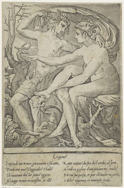 Editor: We're looking at "Loves of the Gods," an engraving by Giovanni Jacopo Caraglio, created sometime between 1515 and 1565. It’s part of the Rijksmuseum's collection. My first thought is how dynamic it is, almost like a freeze-frame of a dramatic moment. The composition feels really packed with figures and movement. What do you see in this piece from a formal perspective? Curator: The most striking aspect is the masterful manipulation of line. Observe how Caraglio employs dense, almost chaotic hatching to create areas of deep shadow, juxtaposed with areas of relatively clear, unburdened lines which define the figures' musculature. The interplay generates a sense of almost frenetic energy that animates the entire scene. Note how the texture of Daphne's transforming skin differs texturally from Apollo's smooth body. This, again, relies on the considered use of line. Editor: It’s interesting how you point out the differentiation using just lines. It almost gives different weight to the two figures. But why choose this technique? Curator: Consider intaglio’s inherent properties. Each line requires deliberate, physical carving. It's not merely representational. The medium thus dictates a particular mode of vision. It demands meticulous planning, creating a dialogue between artist and material, leading to the emphasis we find on textural contrast and directional movement. The formal arrangement here highlights a transition, echoing transformation in the bodies depicted. The figures themselves become manifestations of the very artistic process. Editor: So, the medium itself reinforces the theme. I'd never thought about that. I was focusing on the story alone, not how the process contributes meaning to the figures. Curator: Precisely. And by understanding the artist's handling of line, the relationships and contrasts, we unlock layers of interpretation beyond mere narrative. Editor: Thank you. Thinking about form and artistic choice offers another perspective on the artist's decisions. It opens new ways to appreciating Renaissance engravings.