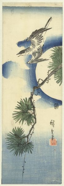 This print, "Vogel in neerwaartse vlucht," was made by Ohara Koson, probably in the early 20th century. Look closely, and you’ll see how Koson captured the bird’s flight with such simple means, how the printmaking process itself is laid bare. I love how the vines and leaves up in the top corner hang down into the image, it feels like the bird is just flying into the frame, a fleeting presence. The texture of the paper adds this depth, doesn’t it? And the colors, those earthy, muted tones, they give the scene a quiet feel, like a stolen moment in nature. I am drawn to the gentle slope of the bird’s wings, they seem to echo the curve of the vine stems, creating a subtle harmony. Koson was so productive, but I am put in mind of the prints of Hiroshige, who like Koson, embraced this sense of peaceful observation.