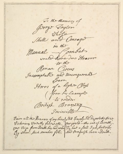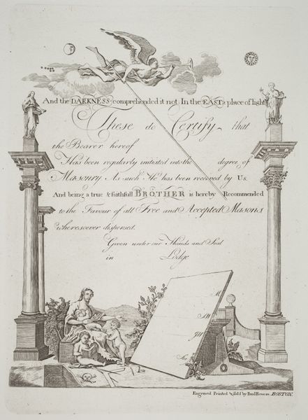 Curator: This delicate engraving commemorates a royal visit. It's entitled "Biljet van het bezoek van de prinses weduwe van Oranje Nassau aan een lithografisch atelier te 's-Gravenhage, 22 februari 1819" dating from 1819 and resides in the Rijksmuseum. Editor: The density of line work immediately strikes me; it's so incredibly detailed, even within such a small composition. I sense a high degree of precision and controlled movement here, like the finest script. Curator: Indeed, calligraphy was held in very high esteem, functioning as an aesthetic performance as well as communication. Consider the symbolic weight, too. The lion, the heraldic shields—these motifs establish status and lineage. They visually reinforce the established social hierarchy of the time. Editor: I am struck by the combination of free-flowing cursive with such rigid heraldic devices, as if striving to create an effect that reflects the constraints put in place by nobility while seeking an organic balance. The placement seems very carefully considered. Note how the weight is at the top and the forms lighten gradually downward. Curator: The visit itself, the "auguste Présence", was a way for royalty to publicly endorse and support artistic enterprise. This gesture would carry significant weight in solidifying the lithographic studio’s reputation and attracting future patronage. It demonstrates the interconnectedness of power, art, and the developing technologies of printmaking. Editor: Yes, but isn't there something undeniably decorative, even mannered, about it all? The flowing lines of the script are beautiful, even considered almost separate from the message they convey. Curator: But those lines were more than just aesthetic; they conveyed respect, gratitude, and cemented a patron-client relationship vital to the artist's survival. This image serves as both record and propaganda—art legitimizing power and power, in turn, supporting art. Editor: I see that now. Looking at it as an object mediating power changes how I view the forms themselves; it suddenly transforms the gestures of calligraphy and places them squarely at the junction of technology, power and representation. Curator: Absolutely. A seemingly simple invitation, a "biljet," unfolds to reveal intricate networks of cultural and economic exchange. Editor: Yes. That’s altered my appreciation of this little artwork significantly. Thanks.
