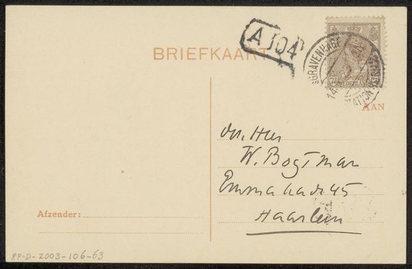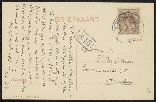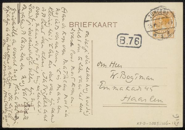 Editor: This is "Briefkaart aan Willem Bogtman" a postcard from 1926 by Richard Nicolaüs Roland Holst, made with ink and pen on paper. My first thought is about the text itself—it becomes a strong compositional element. How do you read this piece, focusing on the formal choices? Curator: Let's consider first the formal tension between the script and the image. We see varied stroke weights and line directions creating contrasting fields. Do you perceive a deliberate arrangement, despite its apparent randomness? Editor: It seems that way, the way the stamp is placed counter to the writing...yes, deliberate. Is it the layering of the words atop each other to create depth, almost like abstract shapes? Curator: Precisely! Consider the interplay between the stamp and handwritten address juxtaposed against the letter's dense body. These create planar relationships and direct the viewer’s eye across the surface. Roland Holst isn't just conveying a message; he's manipulating form through script. Is legibility the aim? Or does the text as image become a more prominent concern? Editor: Now that you point that out, it feels almost incidental to be able to read it, since it's about creating patterns. I see how the text works as textures, and then the stamp becomes a focal point, an interruption of sorts. Thanks for showing me how to consider even simple things like postcards as complex arrangements. Curator: Yes, these formal choices tell us so much about artistic intentions, the work then becomes about exploring possibilities of design itself!