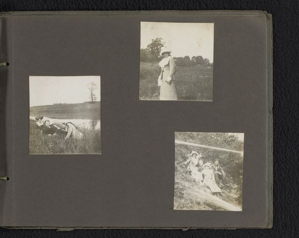 Editor: So, this is "Two people in a park in Brussels, including Ella Uhlenbeck," a photograph by Carolina (Loentje) Frederika Onnen, taken in 1911. It's got a very... sepia-toned, melancholic feel to it. A couple stands stiffly, gazing towards the camera in the middle of a park. The flatness and formality are interesting, a world away from our selfie culture! What strikes you most about this piece? Curator: Ah, yes, a poignant glimpse into a world both familiar and utterly lost to time! What resonates with me, perhaps because I’m such a sap for nostalgia, is that tangible sense of human connection amidst the static. Look at the almost palpable quietness – you can almost hear the rustle of leaves under their feet, feel the chill autumn air on their faces. These are ghosts caught in silver halide, moments plucked from oblivion. Doesn’t it make you wonder about their story? Their lives, their hopes and fears? What do *you* imagine they’re talking about, just before or just after the shutter clicks? Editor: That’s beautiful. Maybe she's just told him a secret and he’s trying to play it cool! I was so focused on the style – the long coats and enormous hat – that I didn't think much about what's happening in the moment. The picture next to it, where the foliage blends into their coats... did they pose deliberately, or did the photographer just stumble across these quiet moments in time? Curator: I suspect there's an element of both deliberate staging, a common practice at the time, alongside the accidental magic only street photography can provide. Back then, photography was more ritual than reflex. Consider it like this: each photograph a collaborative effort, with subject and artist weaving their own narrative into the tapestry of reality. Which version feels truer to you? The deliberate pose or the captured intimacy? Editor: It's probably a mix, I see what you mean. Thanks, this has really changed my perspective! I came in thinking 'old photo,' but now it feels much more alive. Curator: Exactly! And hopefully it invites each listener to weave their own narratives too! I found myself peering deeper into my own life. A photo helps to reflect back your inner world and reveal its mysteries, don't you think?