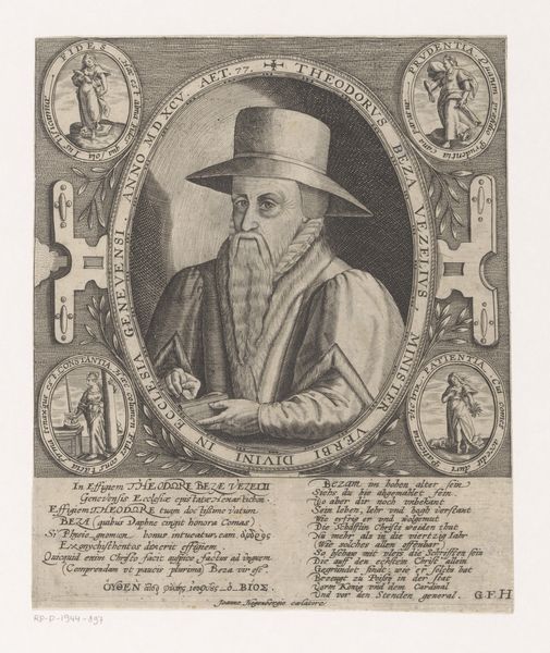 Cornelis Visscher’s portrait of Peter Scriverius employs etching to create a study of contrasts. The subject is framed within a rectangular border, which contains both the man and several lines of Latin text. The formal arrangement is striking: light falls across Scriverius's face and hands, drawing our eyes to the areas the artist wishes to emphasize. Notice how the texture of the hat and robe, rendered through dense and deliberate strokes, contrasts with the smoother treatment of the face. This use of chiaroscuro not only adds depth but also directs our gaze, subtly guiding our interpretation. The choice to frame Scriverius within a constructed border raises questions about representation and reality. Is Visscher merely depicting a man, or is he commenting on the constructed nature of identity itself? The very act of framing suggests a conscious decision to contain and define the subject. This piece encourages us to consider how portraits like this engage with notions of selfhood and the very structures that shape our understanding of who we are.