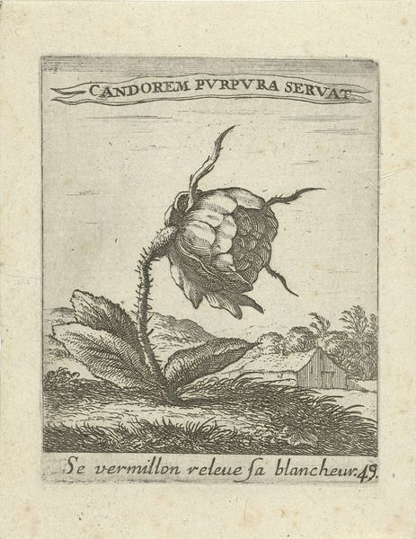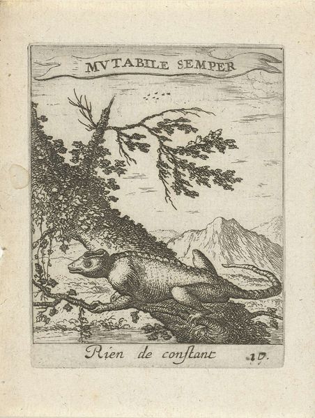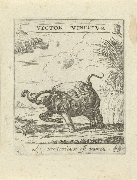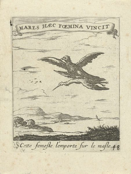 Curator: Welcome! Here we have "Feniks," a print made in 1672 by Albert Flamen. The print presents a phoenix rising from what seems to be a pyre, centered in the composition. Editor: It's so delicate. You can almost feel the heat radiating from those fine etched lines. The starkness, that paper quality—it really underscores the themes of resilience and renewal that the phoenix embodies. Curator: Exactly! Flamen uses the traditional engraving method here, a labor-intensive process involving carving lines into a metal plate to hold ink. This suggests a considered production process for wider distribution, highlighting themes of endurance through readily available reproduction methods. It is a social symbol more than an object d'art, wouldn't you say? Editor: Most definitely! The image of the phoenix is powerful – present across so many cultures. Even the text at the top, “INVITO FUNERE VIVET,” or "he lives in spite of death", encapsulates its enduring significance. And the script below, in French, says: “He will live, despite the death.” Curator: It is intriguing how this relatively accessible medium is utilized to propagate such potent and timeless symbols of renewal. It makes me ponder how artisans were regarded as vital to maintaining the collective cultural memory during the Enlightenment. The dissemination of these symbolic notions into daily material culture signifies social awareness and an artistic response to human tragedy. Editor: It serves as a poignant meditation on history, memory, and the capacity for life to persevere through even the darkest periods. Thinking of what this image meant in 1672 brings up complex themes. The Phoenix carries immense cultural and psychological weight through time. Curator: I find it compelling how the very medium, printmaking, parallels the idea of regeneration, as this allows continuous replications that allow for both cultural and artistic rebirth. Editor: Absolutely. And reflecting upon the phoenix's story—re-creation after destruction—gives rise to ruminations on human potential for recovery after difficulty. What could renewal look like now, or, further down the line, even? Curator: The intersection of craft, symbolism, and widespread consumption in this image encourages reflection on the enduring cultural memories and continuous symbolic impact ingrained in Albert Flamen’s "Feniks". Editor: And to appreciate this powerful creature—this delicate engraving—allows us a space for reflection. It grants access to contemplation on humanity and all its possible forms, after all.
