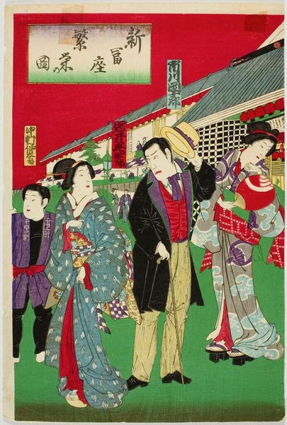 Curator: This is YÅshÅ« Chikanobu's "Picture of the Prosperity of Shintomiza," held here at the Harvard Art Museums. Editor: The striking color and bold composition give an immediate sense of bustling energy. Curator: Exactly. Chikanobu captured not just a scene, but a moment of cultural effervescence at the Shintomiza Kabuki theater. The figures, their garments, and the architecture itself all reflect a society embracing modernity. Editor: Let's consider the woodblock printing process. The deliberate carving and layering of color emphasize both the artistry and the industrialization of art production at the time. Curator: It is equally important to consider the socio-political conditions that led to the rise of Kabuki and its significance to different social strata. It’s not just craft, it's cultural history. Editor: Agreed. Reflecting on the materials and the context gives a fuller appreciation of the complex forces at play in creating this piece. Curator: Indeed. A deeper understanding emerges when we situate art within the narratives of identity, representation, and social change.