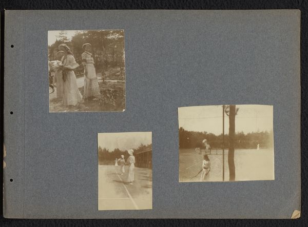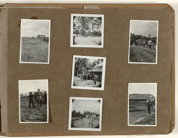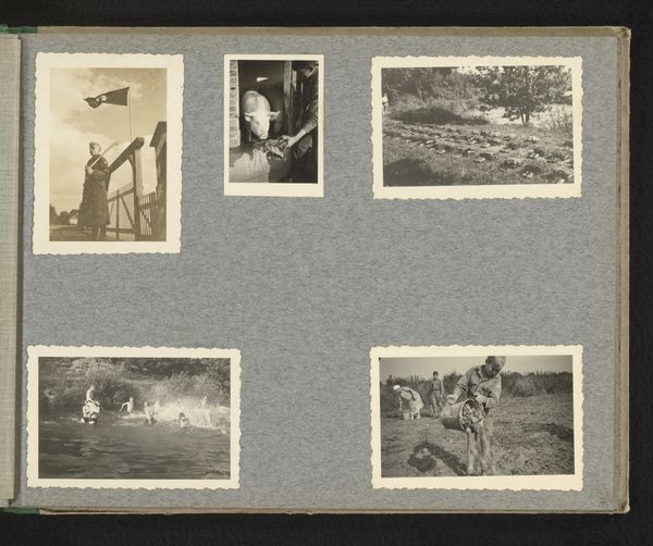Editor: So, this is "Zes portretten van kennissen van Herman Besselaar en Berti Hoppe," an albumen print dating back to about 1930. It gives me a sense of ordinary lives and captured memories. What strikes you most when you look at this compilation of photographs? Curator: This work really encapsulates the spirit of early 20th-century bourgeois life and leisure. What are the subjects doing in these photographs? We see them enjoying the outdoors, posing with family – seemingly unburdened by economic strife. But what about the context in which these images were produced? Editor: That’s interesting! I was just thinking about the individuals shown, without considering any broader implications. Curator: Exactly! The interwar period was rife with societal anxieties related to gender roles, class, and political power. This album of portraits is a highly constructed representation of a very particular segment of society, using leisure and personal connection as key visual signifiers. Consider how access to photography itself becomes a statement. How might the family structure, leisure activities, and the technology used to immortalize these moments reflect existing social hierarchies and gender expectations of the time? Editor: I didn't even consider how much these images reveal about the sitters’ socioeconomic background! It feels like I'm seeing a curated version of their reality, then, through a camera lens that both captures and constructs their identity. Curator: Precisely. Think about how identity and power intersect here – who is represented, how are they represented, and who is doing the representing? The mundane moments depicted can tell a deeper story. It makes me wonder whose perspective is centered and whose is excluded from this selective collection of portraits. Editor: Wow, you’ve totally shifted my perspective. It’s much more complex than just a collection of snapshots. Thanks! Curator: Of course. Hopefully you can view the historical image with fresh eyes!