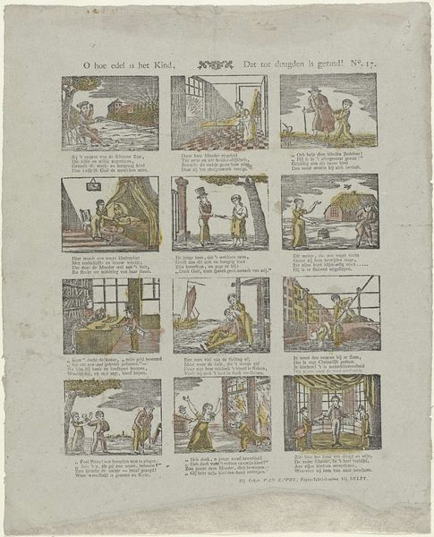 This print, "Ambachten en beroepen," by Alexander Cranendoncq, presents a structured array of twelve vignettes. The monochromatic palette, rendered in ink on paper, limits the visual experience to a study of form and composition. Each scene, encased in a rectangular frame, depicts a different trade or profession. The consistency in the use of line and shading creates a grid-like structure, which is a sort of commentary on the rigid social order of the time, categorizing individuals by their occupations. This system organizes society into discrete, manageable units. The lack of color directs our attention to the details within each frame – the tools, the gestures, the interactions – and asks us to consider how these elements define each occupation. Cranendoncq’s print encourages a structural reading of society itself. The print implies that society is built upon a network of interconnected roles, each contributing to the larger whole.