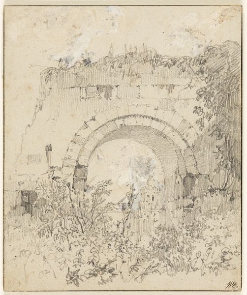 Curator: This unsettling sketch is called "Toren met landennamen," or "Tower with Country Names," possibly dating from 1917. It's attributed to Carel Adolph Lion Cachet. Notice the pen and ink medium used to depict this imposing structure. Editor: It has a somber mood. The lines are scratchy, and the tower leans ominously, with a strange combination of precision and dissolution. The pallid tones are perfect for symbolizing chaos. Curator: Absolutely. Cachet created this work during a turbulent period in European history—World War I was raging. The names of countries inscribed upon the tower allude to the political landscape of the time. It invokes the Tower of Babel, and the futility of trying to force everyone to be in accord. Editor: I can see the connection to Babel. There's a definite fragmentation suggested by the irregular forms. Each section, adorned with a country's name, seems unstable, almost on the verge of collapse. It looks more like a ruin than a symbol of unity or ambition. Curator: And if you look closely, there's a crowd scene at the base of the tower, full of turmoil, and people being forced into cooperation. These are the citizens of Bergopwaarts, compelled by order from above, who will inevitably fall back on internal national forces. Editor: What strikes me most is the tension between the realistic architectural details—those archways and window-like structures—and the overall sense of unreality and nightmarish ambition. There is no balance and it seems to lean to the side, ready to fall, making us fear for the worst, Curator: The inscription around the tower, translated as "What has been, is now, and what shall be, has already been," speaks to a cyclical view of history, particularly poignant amidst the devastation of the First World War. There will be war, and it will not end quickly. Editor: For me, the power lies in the contrasting textures: the dense hatching versus the open space, the bold outlines versus the faded washes of ink. It’s the dynamic interplay of these elements that elevates the work. Curator: Indeed, it prompts us to contemplate the weight of history and the complexities of international relations at that historical time. Editor: Yes, it certainly reveals how the artist captures a deep sense of disillusionment with the grand projects of human ambition.