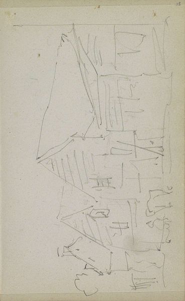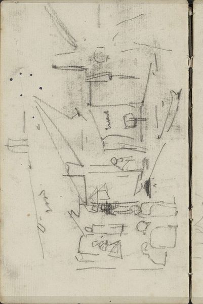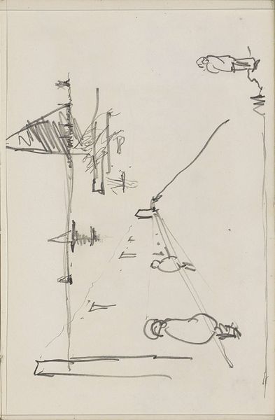 Editor: So, this is "Figure by a Moored Ship, Possibly in a Harbour" by George Hendrik Breitner, created between 1881 and 1883. It's a pencil drawing. It strikes me as very immediate, capturing a fleeting impression. What stands out to you, looking at this sketch? Curator: Immediately, I’m drawn to the economy of line. Breitner's use of pencil isn't about rendering detail; it's about articulating the essential forms and their relationships on the page. Observe the contrasting densities of line: a flurry of dark marks to suggest the hull of the ship versus the delicate, almost hesitant lines defining the figure. Do you notice the interplay between positive and negative space this creates? Editor: Yes, I see it now. It’s less about what’s drawn and more about how those lines define the surrounding space, particularly to create volume within what appears to be the ship. Curator: Precisely. The structure isn't necessarily about a literal depiction, but a framework within which the viewer can interpret the subject. The formal elements—the contrasts in weight, the direction of the lines, their grouping and separation—these construct a visual language that evokes the dynamism of the harbour scene. Editor: That’s interesting. So, you’re saying it’s not really about the ship itself, or even the figure, but the relationships of the marks and voids and the impression that leaves? Curator: Indeed. Breitner masterfully utilises the properties inherent in the pencil and paper. It allows him to hint at forms and environments using the bare minimum. Editor: That definitely gives me a new way of seeing it – less about what it represents, and more about the raw structure itself! Curator: Exactly. Sometimes the greatest insights arise from closely observing the composition's intrinsic properties and appreciating its materiality.