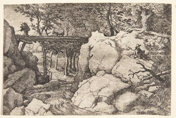 Curator: This is Allart van Everdingen’s "Goat on the Little Bridge", currently residing at the Harvard Art Museums. Editor: Its intricate lines immediately evoke a sense of rustic tranquility, almost like a hidden world. Curator: Note the meticulous detail in the cross-hatching, building form and shadow to create a compelling landscape. The bridge serves as a compositional spine. Editor: I’m drawn to the figure seated on the rocks. What social narratives might be embedded within this pastoral scene, beyond the surface tranquility? Curator: Everdingen uses the etching technique to explore the interplay of light and texture, a demonstration of his mastery of the medium. Editor: It reminds us of our complex relationship with nature, and how our presence, even in serene settings, holds historical and social weight. Curator: Indeed, a fascinating interplay of form and context. Editor: Absolutely, a conversation starter.