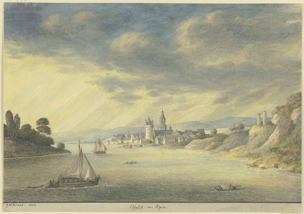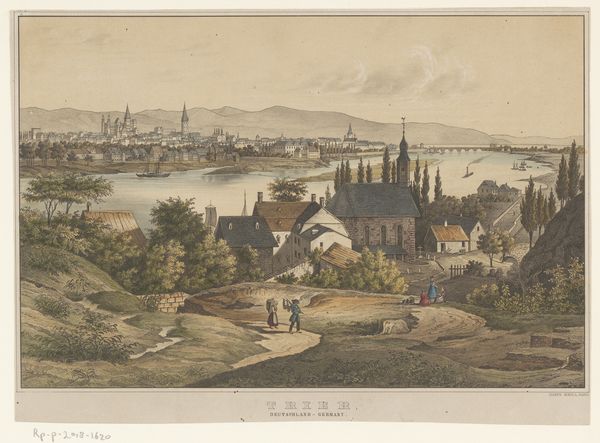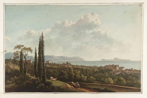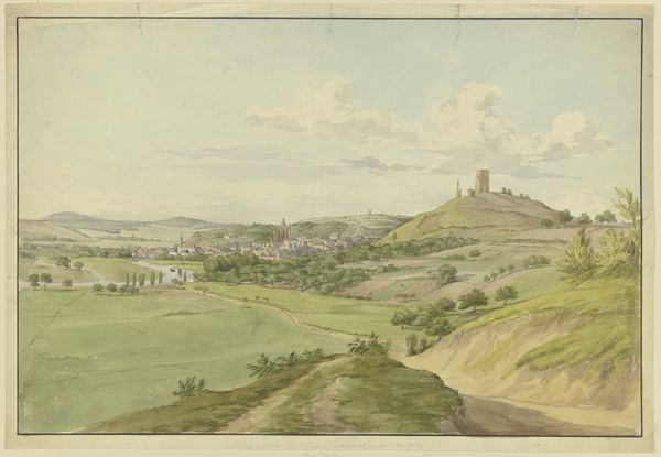 Johann Adam Klein created this view of Bamberg from the south, using pen and watercolor, at a time of significant transformation across Europe. Following the Napoleonic Wars, there was a surge in Romantic nationalism, with artists turning to local landscapes and traditions to define their cultural identities. Klein, positioning us on a hill overlooking the city, captures not just the physical space but also a sense of belonging and historical continuity. The artwork presents a vision of the city's landmarks, the architectural embodiments of religious and political power, from a distance that softens their dominance. In the foreground, the path with two figures suggests an invitation for the viewer to enter and partake in this cultural landscape. This piece reflects a longing for stability and order amidst political upheaval, showcasing a vision of German identity rooted in its landscape and architectural heritage. It invites us to consider how representations of place are always intertwined with narratives of identity, history, and power.