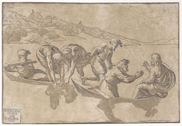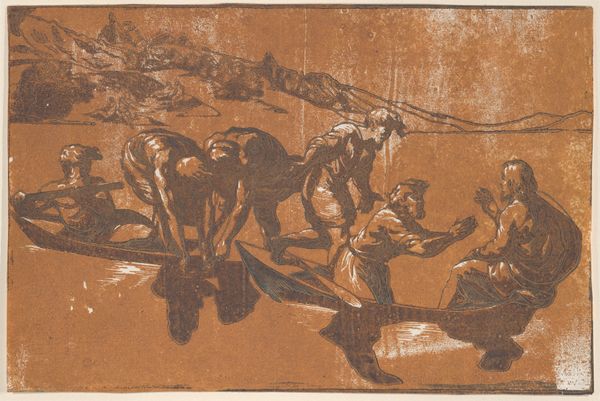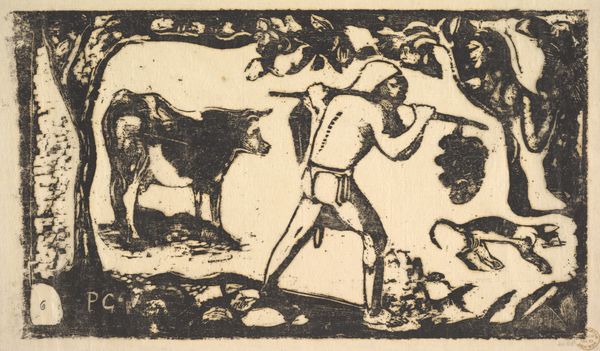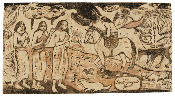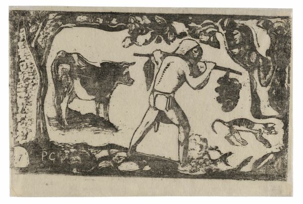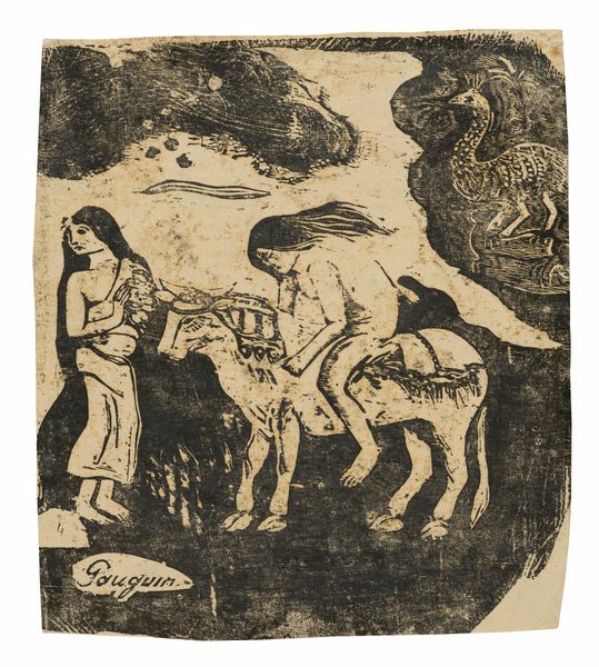 Editor: So, here we have Gauguin’s “Tahitian Carrying Bananas” from 1898-1899, a woodcut print. I find the stark contrast of the black ink against the paper creates a really compelling and somewhat unsettling feeling. How do you interpret this work? Curator: Gauguin is indeed evoking strong sensations. I see a profound yearning for a return to a primal state, one where the symbolic language is embedded within the earth and everyday acts like carrying bananas. Notice how the figure isn't just holding fruit; they carry a burden and a gift – representing sustenance but also a potential for a fall, mirroring images of paradise and loss that reappear across cultures. What emotional resonances does this primal vision spark for you? Editor: The "fall" that you mention makes me think about temptation and Western projections onto Tahiti at the time. Is Gauguin embracing or critiquing that idea? Curator: Precisely! Gauguin masterfully uses familiar images, the serpent-like dog perhaps hinting at temptation, the ambiguous faces within the trees allude to a deeper, almost subconscious narrative. He utilizes these cultural echoes to create his personal mythology, a reimagining of Tahitian life filtered through his own artistic vision, asking if innocence is truly retrievable or just a phantom of Western imagination. Do you see any other loaded images that invite a second look? Editor: The figure’s almost statuesque pose seems to represent this mythologizing too. It all makes you question what Gauguin's true intentions were here. Curator: And that questioning is precisely the point! This woodcut holds a conversation with our collective unconscious, filled with projections, assumptions, and yearnings for a world perhaps more imagined than real. Editor: It’s incredible how such a seemingly simple image can hold so many layers of meaning. Thanks for shedding light on the symbols at play. Curator: My pleasure. By decoding images we discover the ongoing dialogue between ourselves, culture, and history.