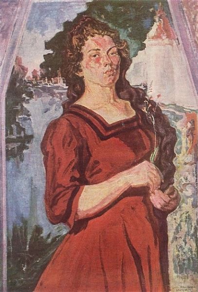 David Burliuk made this Surrealistic Portrait with oil, its date is unknown. Look closely, and you'll see how the colors aren't blended so much as laid down next to each other. I get the sense Burliuk’s process here was one of accumulation, of slowly building up the image through discrete marks. There's a rough quality to the surface, especially in the background landscape. It’s like he’s scumbled the paint on, giving a real sense of texture. The colors, they’re earthy, but with these surprising pops of red in her lips and the patterned shirt. My eye keeps going back to that landscape, those tiny figures and horses. It’s like a dreamscape bleeding into a portrait, the unconscious mind finding its way onto the canvas. It reminds me a bit of Chagall. Both were exploring the way the world exists in our imaginations as much as it does in reality. Ultimately, art is a conversation and a connection, across time and place.