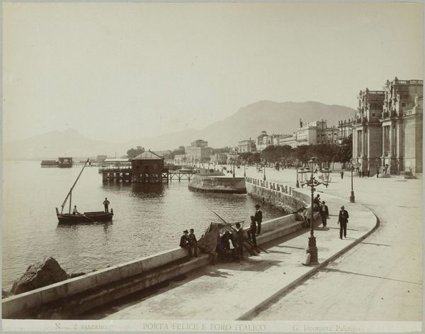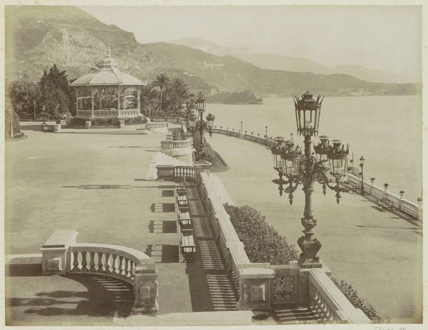 Curator: Welcome! Today, we’re looking at a photograph titled "Boulevard de la Croisette te Cannes," by Neurdein Frères, dating back to the late 1880s. It is an albumen print. What are your initial thoughts? Editor: I’m struck by how…still it feels. It's obviously a bustling place, even back then, but the photograph gives it a serene quality. All those muted tones of browns. What’s your interpretation? Curator: This image is not merely a scenic view; it's a visual document entrenched in the sociopolitical landscape of its time. Photography like this cemented places like Cannes in the minds of the elite as a playground, an escape. Who had access to that escape? Whose labor built and maintained this “serene” environment? The photographic process itself – the choices of framing, composition, the very act of documentation – played a role in shaping and reinforcing power structures. Editor: So you’re saying this photograph, while beautiful, also kind of reinforces a certain…privilege? The gaze of the photographer, capturing the leisure of the wealthy? Curator: Precisely. Consider how this image might have been consumed. As a postcard, perhaps? An advertisement? Each viewing reiterates a specific narrative, a romantic vision carefully constructed to entice a particular audience. Do you notice how the working class are absented from the composition? How the space seems designed specifically to preclude those bodies? Editor: I see what you mean. The lack of diversity within the space itself makes the photograph inherently political, subtly endorsing the exclusivity of the location. So this picturesque image conceals deeper societal issues? Curator: Absolutely. Photography doesn't simply reflect reality; it actively shapes our understanding of it. Reflect on what isn't shown – those are the silences that speak volumes about the power dynamics at play. Editor: I’ve definitely learned a lot about the silent stories this photograph is trying to tell. It really challenges you to look beyond the surface. Curator: And hopefully encourages you to question whose stories are being told, and whose are being intentionally left out.