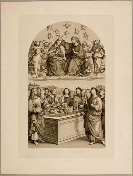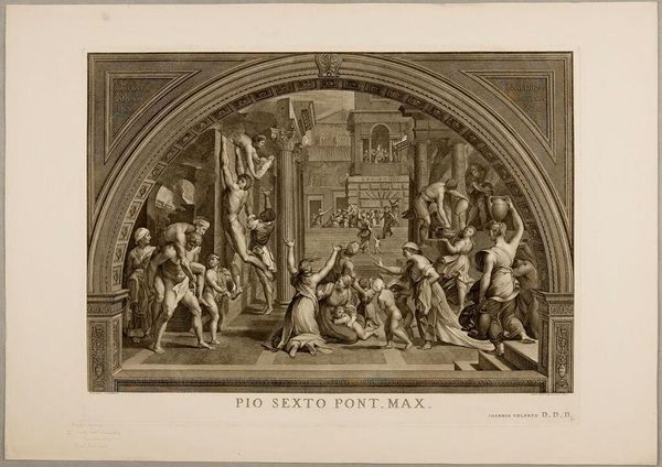 Editor: This is Giovanni Volpato's "Parnassus." It's quite detailed, almost like a photograph, even though it doesn't have a date. What do you see when you look at it? Curator: Oh, it whispers of a Renaissance dream! All those figures, draped and poised, gathered around Apollo. I imagine the air thick with the scent of laurels and the murmur of inspiration. It’s a very idealized vision of artistic community. Editor: Idealized how? Curator: It's more about showcasing the harmony of artistic pursuits than depicting the messy reality, don't you think? Like a perfectly staged tableau. Editor: That's true, I hadn't thought of it that way. It does seem a bit too... serene for real life.