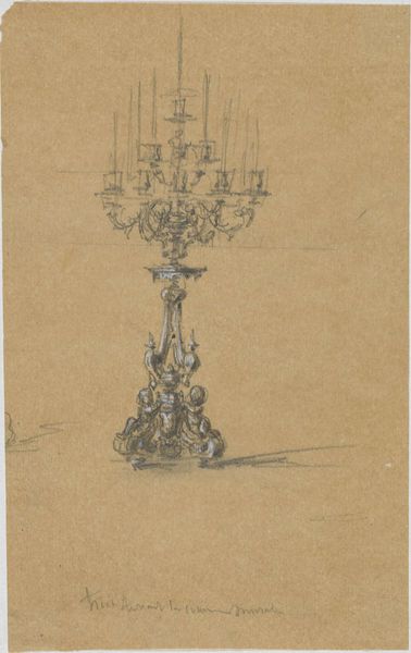 This drawing presents a design for a candlestick holder, crafted by an anonymous artist, and features a female figure holding a bowl. The drawing, though seemingly simple, encapsulates significant historical and cultural narratives around gender and labor. In rendering the figure as a caryatid, the artist evokes classical architectural motifs where female figures are used as structural supports. This choice intersects with the historical roles ascribed to women, often seen as foundational yet frequently unacknowledged. The woman, while central to the design's function and aesthetic, is also subjected to bearing weight, reflecting traditional gendered expectations of women carrying the burdens of domestic and social structures. The subtle details of the drawing, the scale of the figure relative to the elaborate candlestick she supports, prompt questions about visibility and value. It invites us to reflect on the emotional and physical labor that often goes unseen, and how these artistic choices mirror societal norms.