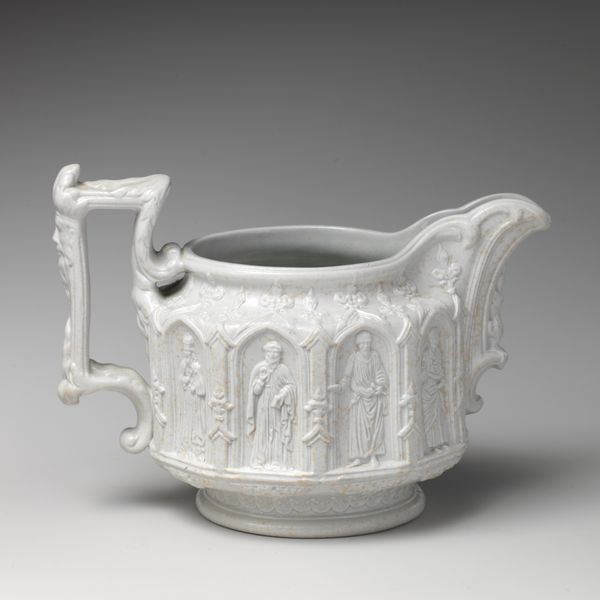 Editor: So, this is a pitcher made by the United States Pottery Company, sometime between 1852 and 1858. It's earthenware with a creamy, white glaze, currently held at The Met. The molded design mimicking woodgrain makes it almost look like a little, petrified tree. How would you interpret a piece like this? Curator: Focusing on the material reality of this piece reveals much about its cultural and historical context. We see an earthenware pitcher striving to imitate the textures and forms of wood. This conscious manipulation of materials prompts questions about the mid-19th century consumer culture. Was it intended for the middle-class home? Editor: That’s an interesting idea – accessible nature for a rising class. Curator: Exactly. Think of the labor involved in creating such a piece. The process wasn't about celebrating the rawness of the earth. This object represents the aspirations, material values, and industrial capabilities of the era. Also, note how this ceramic form mirrors organic structures. Doesn’t that choice also speak about our evolving relationship to nature? Editor: I see your point. It almost hides its own ceramic nature by taking on this other form. I suppose that speaks volumes about shifting values during industrialization. It’s quite interesting, when we focus on the material, how that unfolds! Curator: Precisely. What begins as a quaint decorative object actually provides insights into labor, materiality, and the developing world around it. It certainly encourages you to investigate further. Editor: It does, indeed. Thinking about art in terms of process makes it far more accessible, rather than feeling I need to focus solely on some grand, unachievable intention. Thanks so much for this insightful way of considering the work!