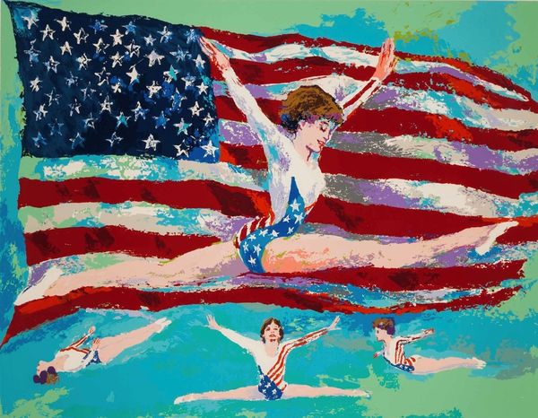 Curator: Just looking at "Swimming" evokes this rush of movement. Like, bodies suspended, colors exploding, the world seen through a liquid lens...almost otherworldly, don't you think? Editor: Absolutely! This is a promotional print, most likely an acrylic poster for the 1996 Centennial Olympic Games, created by the artist Hiro Yamagata. Notice the distinctive pop art influences? It’s fascinating how art gets enlisted to project particular cultural narratives about bodies and nations. Curator: Narratives, yes! I’m drowning in feeling something very real, seeing something totally fantastic. That palette! Almost neon...like our world hyper-saturated and a bit surreal. I suppose the floating spheres amplify that sense of immersion. It seems like something of a playful twist on the modernist style, isn’t it? Editor: Exactly! You know, this work also pulls from naive art traditions, those deliberate, often joyful representations of a complicated world. Here the simplified figures speak volumes about the ideals of athleticism, international cooperation, and visual style. Plus, it reminds us that the commodification of these ideals through official imagery. Curator: So the painting presents both spectacle and deeper politics. Makes you wonder if the splash is supposed to hide all of that. To me it shows joy first. Editor: Well, art at the Olympics, let alone poster design, sits in this strange place as both aesthetic object and advertisement for a whole country and everything it means. Can it achieve freedom, though? Curator: In those bursts of pure, electric color, yeah, maybe it does find a pocket of genuine wonder. It lets my soul float a bit, if you will. Editor: It’s an artifact worthy of critical appreciation and political scrutiny, isn't it? Curator: For me? Just something wonderfully weird to stare at and get lost in, politics aside. It really stirs up those thoughts that make my spirit swim around!