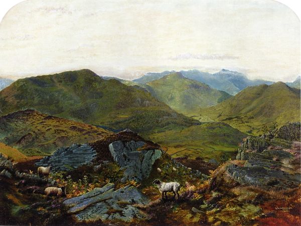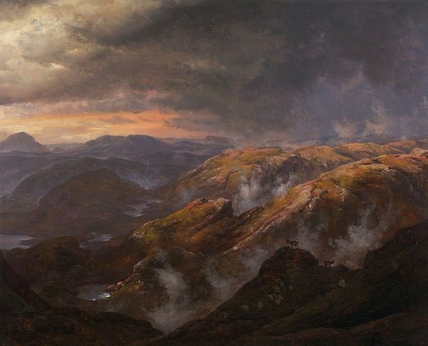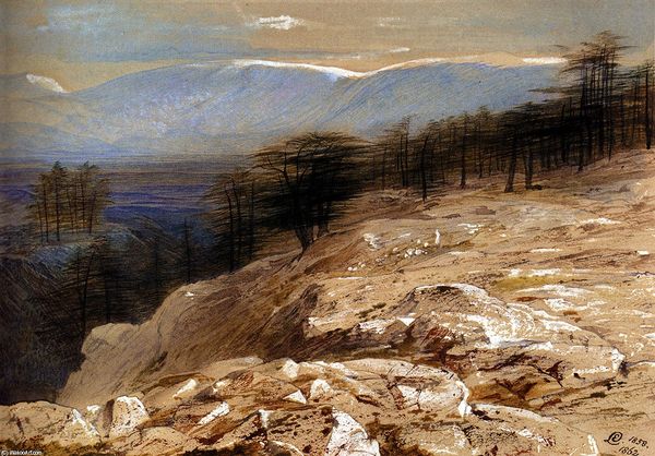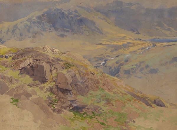 Curator: Alfred William Hunt's "Cwm Trefaen" presents a sweeping vista, seemingly untouched by human hands, capturing a Welsh valley through muted, contemplative tones. Editor: It feels like a vision emerging from memory, imbued with a sense of the sublime but also... loss. Is that the right word? Curator: Perhaps. The romantic movement, out of which Hunt emerged, saw landscape as a canvas onto which anxieties about industrialization and societal shifts were projected. This valley, then, is not merely scenery. Editor: I see it as a symbol of resilience, of the earth's enduring power despite its harshness, echoed through the enduring presence of the mountains in Welsh culture and mythology. Curator: Absolutely. And looking at the brushwork, the way he evokes the changing light and weather, it mirrors the social and political flux of the era, reminding us of the importance of preserving our natural and cultural heritage. Editor: It's a powerful reminder that landscapes hold stories, both personal and collective. Curator: Indeed, stories we must keep exploring and sharing.