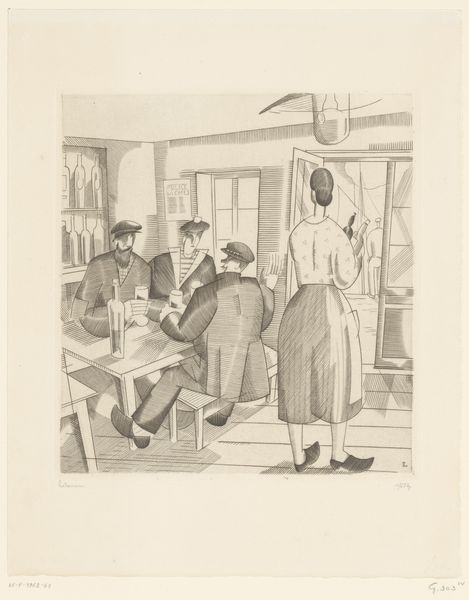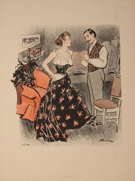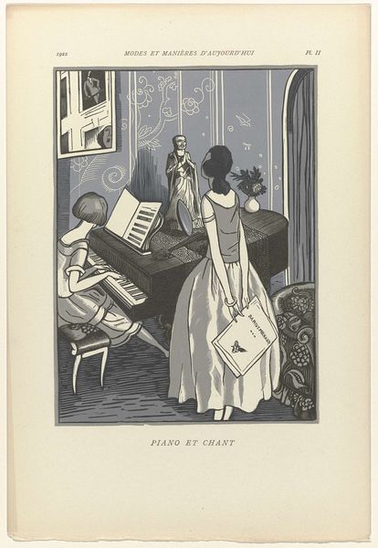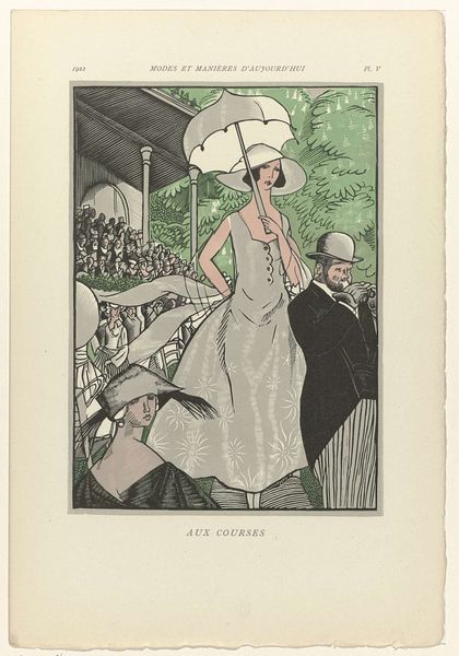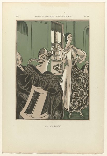 Fernand Siméon made this print, Modes et Manières d'Aujourd'hui, in 1922. What strikes me is the simplicity of line, it's almost like a coloring book, but with so much more sophistication. The marks are confident, not overworked, creating a world that's both glamorous and accessible. I love how the pink pops against the grayscale, especially on the woman’s dress. It's like a spotlight, drawing you into the dance. Look at the hatching on the tables, it's so direct and unfussy, yet it gives the scene so much depth. This approach reminds me a little of Dufy. Both have this effortless way of capturing a scene, making it feel both modern and timeless. Ultimately, it celebrates the everyday, finding beauty and style in the simple act of living and moving.