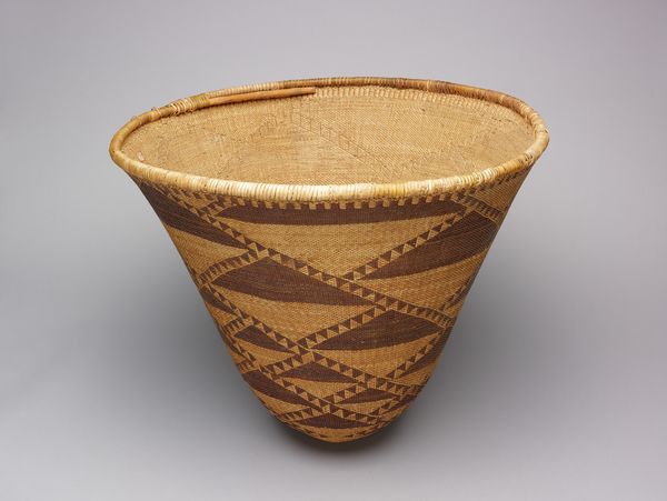 This basket was made by Indé, who was Apache. The evenness of the weaving and the patterns wrapping all the way around – you can just feel the maker's hand and patience! The straw material is like a painting surface here. It’s built up slowly, row by row, to create this vessel. See how the surface is both textured and soft? The dark bands are woven right in, creating geometric shapes that almost seem to float on the surface. There’s a subtle shift where the basket curves inward – it’s like a breath being held. That's where the pattern changes, too, becoming more dense and darker near the top. It reminds me of the work of Anni Albers, who also saw weaving as a way of drawing in space. It’s all about how the simplest materials, repeated over and over, can create something unexpected and beautiful.