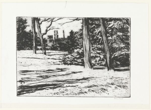Curator: Looking at Max Liebermann's "Canal, Amsterdam," it's hard not to be immediately drawn into the interplay of light and shadow. There's a brooding quality, almost melancholic. Editor: It’s fascinating to consider the tools at play. An etching like this relies on the deliberate scratching of a metal plate to capture the subtleties of that light. Curator: Absolutely. And that light has such symbolic weight. It peeks through the dense trees, illuminating figures in the distance. It suggests a kind of hope or revelation amidst the urban landscape. Editor: I agree. The textures created through the etching process, the lines and the varied darkness, lend a tactile quality, almost like feeling the dampness of the Amsterdam air. It really brings the process to the fore. Curator: It’s a wonderful piece, really offering a glimpse into Liebermann's visual language. Editor: Yes, the materiality really enhances the emotional impact.