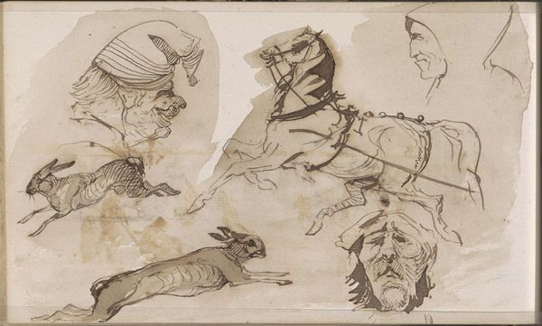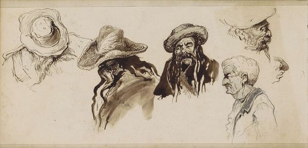 Editor: Right, next up we have "Mannenkoppen en een vrouwenkop" - or "Male Heads and a Female Head" - created in 1839 by Johannes Tavenraat. It's a drawing, made with pencil, and it's currently housed in the Rijksmuseum. It looks like a page torn straight out of a sketchbook! What leaps out to you? Curator: It's that raw energy, isn’t it? The way Tavenraat just lets the lines *breathe*. Look at the helmeted figure—he's not just drawing a soldier; he's exploring a *feeling* of strength, maybe a hint of bravado teetering on the edge of foolishness? You almost want to write a story about them all, don't you? I'm really seeing a theme of "exaggerated features and varied characters." How do you feel it fits in with realism and romanticism? Editor: Absolutely! It’s theatrical but so raw. With realism I think I see the imperfections emphasized... and how about romanticism? Curator: I wonder if it isn't in the *yearning*. See, Romanticism wasn’t just about pretty landscapes; it was about a hunger for something *more*. I imagine Tavenraat sketching furiously by candlelight, wrestling with his own sense of…longing. Think about those lines again: scratchy, searching, not quite resolved. That unresolved-ness…that's the heart of Romanticism for me. And with a bit of realism. A real romance, perhaps? Don’t you think it evokes a feeling of connection to people, to humanity? Editor: Yes! It suddenly feels so alive, like peeking into the artist’s mind as he people-watches! I never considered that pencil lines could "yearn," or at least express it. That helps me understand the art and era that comes after much better too, which makes this sketch particularly thought-provoking! Curator: I agree, these kinds of preliminary character works are very enlightening! Now what sort of stories might you assign these figures based on their expressiveness?