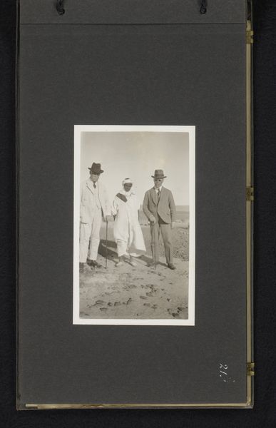 Curator: Welcome to this striking pair of gelatin silver prints, likely taken between 1933 and 1938, and titled "Eugen Wachenheimer op het strand met fototoestel om zijn nek, augustus 1933, Travemünde." It's from the Wachenheimer family archive. Editor: Immediately, there’s a poignant stillness about these photos. The muted tones, the solitary figure… it whispers of a particular kind of solitude, doesn't it? Like he's the only splash of permanence on a vast, windswept beach. Curator: Absolutely. The medium itself, gelatin silver print, offers a glimpse into the era's photographic practices, a period grappling with both technological advancement and political turmoil. Consider the process, the darkroom alchemy involved, each print unique and handmade. It speaks to the labour inherent in creating images, not simply capturing them. Editor: The deliberate framing, with the slightly uneven, almost playfully torn edges of the print itself adds so much to the experience, feels intimate. His camera dangling, his sturdy briefcase… it's like he's frozen, perhaps contemplating the scene, perhaps documenting it, or maybe he’s bracing himself before something. There's an unsettling ambivalence I find myself circling around, the eye is so focused to the beach, in his stance there seems like he is prepared for a walk on it and not so focused on documenting anything... it almost creates an alternative. Curator: The location, Travemünde, becomes significant considering the political climate of Germany in the 1930s. A seemingly innocuous beach scene is thus embedded within a much larger, fraught historical context, given what the Wachenheimer family would have experienced in that period. Editor: Right. The casual appearance almost lulls you in but the photograph, being a print of its time, it takes so much of that casual feel from its viewer, giving this sense that there is something going to happen, as he seems worried in each photograph. Each mark carries the weight of history. Curator: It invites reflection on photography's role, as both an art form and a means of historical documentation but this portrait captures more than just a moment on the beach. It's about preserving the ordinary amid extraordinary times, in that it also highlights the work and labor behind taking such pictures. Editor: Yes! Ultimately, it’s a ghost of a moment caught in light and chemicals and labor of art. Thank you for lending that context! Curator: And thank you for unveiling this quiet sense of urgency I might have glanced past.