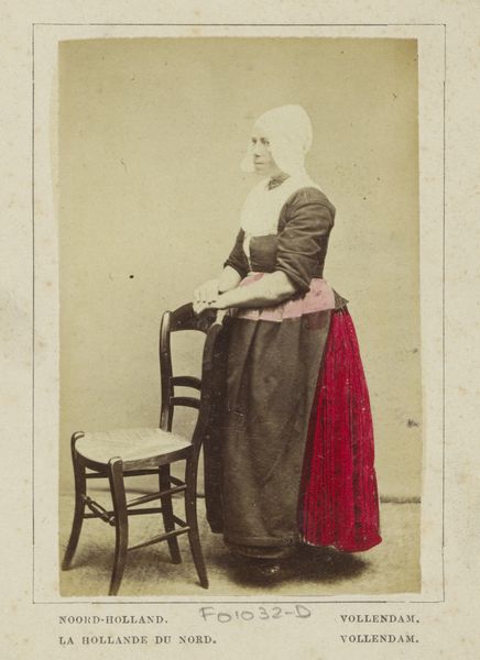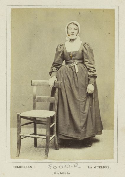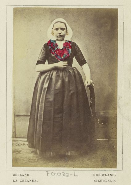 Editor: This is "Portrait of an Unknown Woman with Photo Album or Book in Costume of Middelburg, Zeeland," a photograph from between 1860 and 1890, housed here at the Rijksmuseum. I find the woman's stare really striking. She looks almost…confrontational. What do you make of her, and the setting? Curator: Well, the intensity you feel could come from many things. Portrait photography was still fairly new then, requiring subjects to hold still for quite some time. I wonder what stories her clothes would tell - so particular to that region of Zeeland! I can't help but speculate, given the book or photo album in her hand, about what she valued and the images or ideas that this would capture, her personal identity at that time, especially for women... Do you see a sense of staged formality here? Or does she surprise you with something unique and human? Editor: I see what you mean about formality, the setting feels constructed, but I still feel like I'm getting a glimpse into a real person’s life. What does this picture suggest about Dutch society at that time? Curator: I think that's spot-on, actually. You’ve keyed into the heart of it! During this period, the Netherlands was experiencing significant social and economic change. The burgeoning middle class started using photography to record their lives, so this is likely a fascinating assertion of regional pride. Editor: So it's both personal and a little political? Curator: Precisely! Think of it as visual declaration. This portrait is a window into a specific time and place, capturing the individual within a larger social framework. It's the "Zeeland experience" caught on camera. Editor: That makes so much more sense. I never considered the image as something "declared", but as something "shared", now I can look at the artwork from a different point of view. Thanks. Curator: My pleasure! It’s truly a thought-provoking thing when the simplest things carry such a big meaning with it.