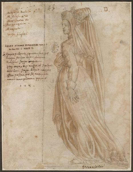 Curator: This is Francesco Terzio’s rendering of Elizabeth, second wife of Rudolph, King of Bohemia. Terzio sketched it with pen and brown ink. Editor: The queen's gaze is quite arresting. Even in this monochromatic drawing, the weight of her position is palpable. I can see the regalia but also the individual, the woman. Curator: Absolutely. The symbols are layered. Notice the crown, of course, but also the detail in her garments. Each element tells a story of wealth, power, and lineage. Editor: And considering the dynamics of royal marriages, this image raises questions about agency, about who controlled the visual narrative of women like Elizabeth. Curator: That's an important point. The sketch offers us glimpses into the fashion and symbolic language surrounding royalty. These were deeply embedded in the cultural memory. Editor: Examining these visual records provides an opening to interrogate the power structures of the time and the roles assigned to women within them. Curator: Indeed. By focusing on these subtleties, it offers a lens into a world far removed from our own, yet still echoing with familiar cultural ideas. Editor: It reminds us of the long history and the continued struggle for autonomy.