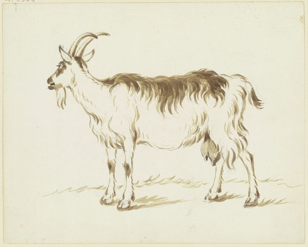 Editor: Here we have Friedrich Wilhelm Hirt’s “Stehende und liegende Ziege,” or "Standing and Lying Goat," an ink drawing that resides here at the Städel Museum. There's something so calm about the contrast between the upright, attentive goat and the relaxed one lying down. What catches your eye? Curator: The symbolism is so rooted in agrarian life! Notice the way the artist positions the standing goat—almost a guardian figure. Goats, throughout history, have represented virility, abundance, but also stubbornness and untamed nature. The lying goat... how does its positioning strike you? Editor: It feels passive, content perhaps? Like a domestic scene, where both vigilance and rest are present. Curator: Exactly. Consider how the cultural memory of the goat contrasts: sacred in some mythologies, scapegoats in others. The dark ink wash against the light, reclining goat…is there a potential dichotomy there, in the cultural unconscious? One stands, aware and defined. The other rests, perhaps more innocent. Hirt uses the animals and ink to explore how we perceive order versus freedom. Do you find the depiction idealized, or realistic? Editor: Maybe a bit of both? The rendering feels quite lifelike, but the composition is so balanced, so deliberate... Curator: Indeed. Hirt acknowledges both the physical reality and symbolic weight. Understanding this interplay is key to appreciating this drawing's understated complexity. Editor: I never thought about the symbolic contrast between a standing and lying animal! That really opens up the work for me. Curator: It's in recognizing those layered meanings that art truly speaks across centuries.