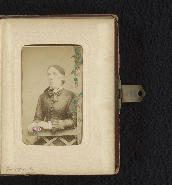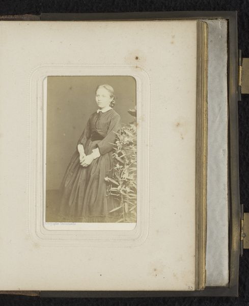 Curator: This albumen print, "Portret van een staande vrouw, leunend op een vaas op een tafel" roughly translates to “Portrait of a standing woman, leaning on a vase on a table”. It's from somewhere between 1865 and 1900 and is attributed to Hermanus Jodocus Weesing. It's interesting, isn’t it, how these seemingly simple portraits can reveal so much about the subject’s social standing and the aesthetic sensibilities of the era? Editor: Yeah, there’s this melancholy mood. The lighting, that steely gaze… and she leans on this ornate prop with the blankest of expressions! Almost daring us to ask her anything. But look closer – those age spots add such strange character. What do you see? Curator: I see a carefully constructed performance of middle-class respectability. The woman's dress, the pose, the prop – all communicate a desire to be seen as refined and cultured. But I also see hints of constraint, perhaps even a subtle resistance to the roles imposed upon women of her time. She stands, rather than sits – not in compliance, necessarily. Editor: I feel that. And those sleeves – talk about power dressing. But what about that vase she is leaning on, literally and figuratively. Such a cliché, maybe? Though without it she's just... standing, period. Is it supposed to imbue her with education or class? Curator: Precisely. The vase and draped cloth are part of the visual language of 19th-century portraiture, symbols of wealth and status but also stand-ins, you see, that signal some connection to classical antiquity and learning. It elevates the subject beyond the mundane. Yet these props also highlight how the representation of women at this time could also be formulaic, trapped within narrow expectations. Editor: A gilded cage, photo style. It reminds me a bit of early theater with a female lead… But let's jump forward to today – does this make anyone reconsider how identity works in contemporary portraiture, online even? Filters, perfect angles, the whole works? Curator: Absolutely. By studying portraits like this, we can better understand the long history of how people have used images to shape and project their identities. Recognizing how certain visual conventions—poses, props, even the absence of a smile—functioned in the 19th century allows us to be more critical and self-aware about the visual messages we consume and produce today. There’s power in seeing then and now as interlinked! Editor: Very well said! Suddenly, that stern Victorian lady is all of us... or maybe none of us. Thanks for shaking me out of my contemporary perspective.