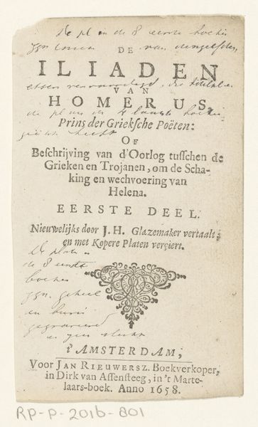 This is the title page designed by Romeyn de Hooghe in 1679 for Steven Blankaart’s translation of Lucian of Samosata’s complete works, rendered in ink on paper. The composition is structured by a hierarchy of typography, setting the title "Alle de Werken van Lucianus" in bold, larger fonts, which then decreases in size down the page, creating a visual rhythm. Below the title, a complex, interwoven design element is presented—a floral knot. Its intricate, curvilinear forms contrast with the sharp, rectilinear lines of the text. De Hooghe destabilizes the traditional role of ornamentation in book design by integrating a pattern that's both decorative and conceptually dense. The interplay between text and image invites exploration into how meaning is constructed through visual and linguistic signs. The floral knot might be interpreted as a signifier of nature, knowledge and interconnectedness. The very act of translation, suggested here, can be seen as an interpretation of signs, a weaving together of different cultural and linguistic codes.
