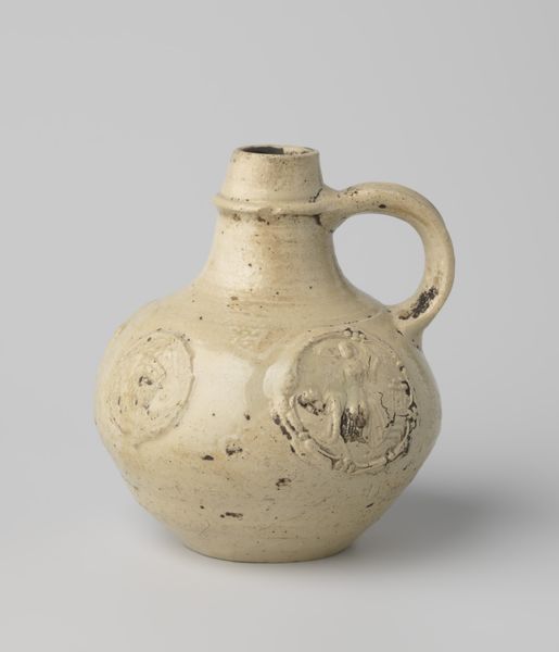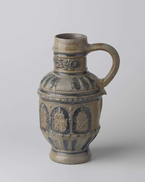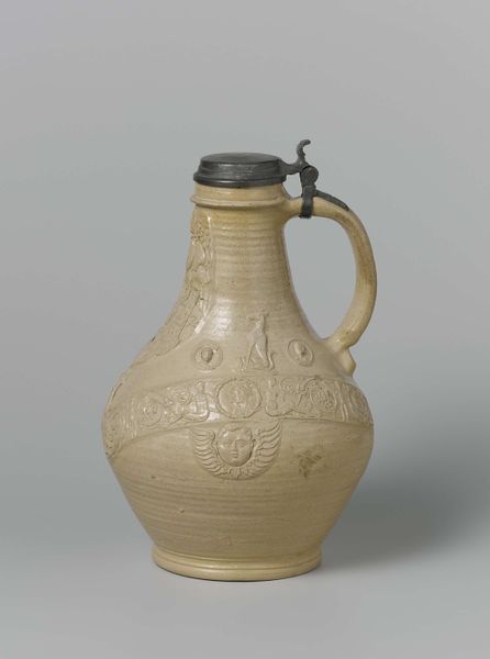 Curator: Here at the Rijksmuseum, we’re looking at a stoneware jug by Joseph Mendes da Costa, titled "Bak van steengoed met zoutglazuur" and it dates to 1901. Editor: My first thought is of practical use elevated into art. There’s a beautiful humility to it. The form, though simple, feels so complete and grounded. Curator: Let's dive into that "practical use." The material, salt-glazed stoneware, wasn’t just chosen for aesthetics. The process involves adding salt to the kiln during firing. The sodium vapor reacts with silica in the clay, creating that durable, slightly textured, glassy surface. Mass production in early 20th century used this to churn out cheap ware...what do you see? Editor: I notice that repeated rosette motif encircling the top and the base, suggesting a dance. Rosettes have meant protection, or illumination through centuries. Seeing them rendered in the earthy tones of the stoneware makes them feel deeply connected to the domestic sphere, bringing light and joy into the everyday ritual of pouring, perhaps water or beer or wine. Curator: Right, these motifs may elevate our "everyday ritual" by signaling to folk stories about hearth, home, and protection from the elements through art, in an era defined by increasingly unsafe industry and dense smog! I see Da Costa using repetition to connect to older folk wares, a trend among his contemporaries, while industrialization and social anxieties started creating gaps between "art" and "craft." Editor: And it’s that very connection – this bridge between industry, artistry and simple use - that strikes me most powerfully. A timeless object whispering stories of warmth, sustenance and memory. Curator: Well, looking at this piece from a maker's viewpoint helps appreciate how Mendes da Costa cleverly worked to bring "low" ceramic craft to a wider audience beyond his usual marble statues displayed in galleries. It becomes about art meeting functionality for a growing number of city inhabitants. Editor: Yes, a truly lovely thought! And now when I look, I don't just see a jug but a carrier of untold, intimate stories. Curator: Likewise, considering how Mendes da Costa worked within craft to signal folk elements is a clever nod to his audiences.