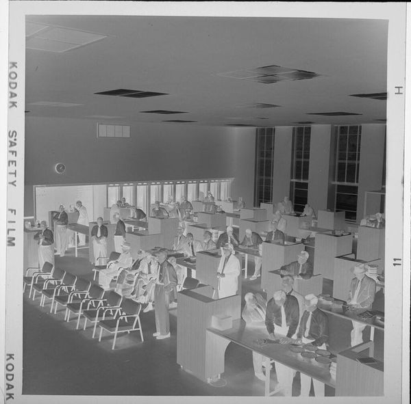 Curator: This is an untitled photograph by Jack Gould, capturing businesspeople in what appears to be a Mercantile Exchange auditorium. It’s a small work, roughly 2 1/4 inches square. Editor: My first impression is one of almost oppressive quiet. The rows of figures feel like cogs in a machine, each isolated in their little cubicle. Curator: It does feel quite detached. Perhaps Gould was exploring the alienation of labor within these economic structures. The image's formality and the subjects' uniformity contribute to that sense. Editor: And consider the position of power these people occupy. Their actions, though seemingly isolated, have global repercussions, often exacerbating inequalities. Curator: It’s a stark reminder of the human element, or perhaps the lack thereof, within these financial systems. The photograph invites us to reflect on the ethical implications of our economic structures. Editor: Indeed. And the photographic inversion somehow amplifies the surreality. It gives us a critical distance. Curator: It's a fascinating glimpse into a world that shapes so much of our own.