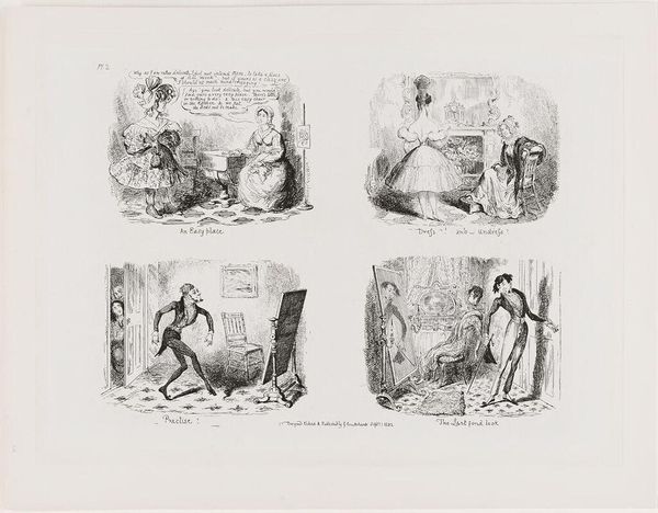 Editor: This is "Tails!" by George Cruikshank, a print in the Harvard Art Museums. It's all these little scenes, each playing on the word "tail." What do you make of the material context of this piece? Curator: Well, consider the printing process itself. Etching allowed for mass production, making social satire like this accessible to a wider audience. Who was consuming these images, and what kind of commentary was Cruikshank offering about their lives and values? Editor: So, it's not just about the jokes, but also how these images were made and circulated. Curator: Exactly. The choice of materials and the method of production are deeply connected to the work's meaning and impact. Editor: That's a fresh way to think about it. I'll definitely consider the production next time.