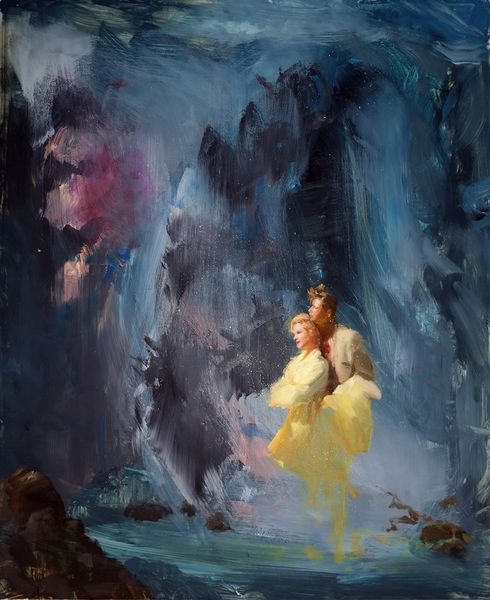 Curator: Standing before us is Joshua Flint’s 2016 oil painting, "Mapping a Galaxy." Editor: Wow. It's serene, but deeply unsettling. That misty cityscape looming behind them…gives me chills. Are they about to jump? Curator: Possibly. It evokes the Romanticism of Caspar David Friedrich but tinged with modern anxiety. Observe how Flint contrasts the sharply defined figures with the almost dreamlike haziness of the city in the background. Editor: It's clever. The painting has a surrealist leaning. I think Flint may use the figures as a grounding device—they become observers like us. See how they are situated on this precipice or edge? A point of divergence or possibly convergence. Curator: I agree. The composition emphasizes division—nature versus the constructed world. Yet there's a fluidity implied, isn't there? Almost like an unspoken longing. It speaks volumes about modern life, where progress is always encroaching on something, but without clear destination. It all adds up to something powerful, and unnerving. Editor: I can imagine them poised between eras. That grid is interesting as a pattern to dissect further: the geometry of it. I sense he might have taken pleasure in deconstructing and rendering urban sprawl so clinically and deliberately. Curator: His process involves a mix of photography and historical references. Note the subdued, almost monochrome palette; it invites introspection, asking questions about where we locate ourselves. The oil paints serve it nicely! Editor: Definitely. He layers ideas. His painting style provides us room to wander... it evokes multiple readings and emotions within me all at once. I find that fascinating about modern art and this piece specifically. Curator: Precisely! That’s Flint’s brilliance. Thank you for helping me map this painting. Editor: The pleasure was all mine. An introspective experience.