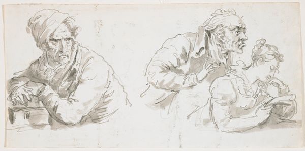 Curator: This drawing, simply titled "Two Kneeling Figures," is attributed to Benjamin West. It's rendered in ink, almost a sepia tone, presenting two figures in a posture of supplication. What's your immediate reaction? Editor: A visceral sense of despair. The hunched postures, the faces buried… it speaks volumes about submission and perhaps grief. There's a real rawness in the lines, too. Curator: Indeed. The rapid, almost frenzied, lines contribute to that sense of urgency and emotion. West, although quite successful within the Royal Academy system, often grappled with representing intense emotional states within established academic conventions. I think this work captures some of those tensions. Editor: Absolutely. I wonder about the broader social context, though. What narratives of power, religion, or even political oppression are we engaging with here? Were these studies perhaps connected to representations of colonial subjects, begging for reprieve or justice from a dominant colonial figure? Curator: That’s a fascinating lens to view it through. It’s difficult to pin down a specific narrative without concrete documentation; we lack identifying details in both the subjects. But considering the era, the drawing invites intersectional interpretations concerning faith, humanity, and justice in colonial contexts, absolutely. And also the dynamics of patronage and power between artist and sitter if these were intended as portraits. Editor: And the implications of choosing to depict these figures from behind, partially obscured… What’s revealed and what’s concealed speaks volumes about the intentions of the artist and what kind of social and institutional constraints that they're faced with. It feels loaded with social commentary. Curator: The ambiguity could also serve to heighten their universality, allowing the viewer to project their own understanding of sorrow and subjugation. And while West certainly achieved notoriety in Britain’s Royal Academy, which itself functioned with its own set of dynamics, West's early American roots undoubtedly shaped his world-view. Editor: Thank you. Considering West's unique position straddling the US and the United Kingdom and the cultural and political contexts of his artwork provides important social context and awareness of the role artistic constraints played during this time. Curator: Precisely. Considering social contexts enriches our appreciation. Thank you for shedding further light onto it!