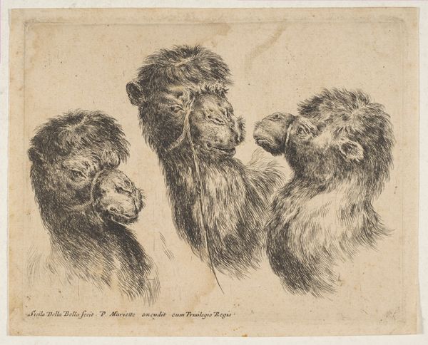 Curator: What a striking pair of studies! This etching, “Two Camel Heads,” was created by Stefano della Bella sometime between 1636 and 1646. It currently resides here at the Metropolitan Museum of Art. Editor: My first impression is the sheer detail; the rendering of the fur, the soft shading. The overall effect is both intimate and a bit melancholic. I'm immediately curious about the etching process and what type of tools Della Bella might have employed. Curator: Exactly. The controlled chaos of lines— the deliberate mark-making! Consider the availability of paper, inks, and the printing press during this period. The rise of printmaking allowed for wider dissemination of images, thus playing a critical role in shaping perceptions about far-flung places and the animals that inhabit them. What narrative do you believe he was telling here? Editor: The subtle textures are fascinating. The lines clearly have an expressive quality beyond just depicting fur; you feel the camel's coarse hair against your fingertips, or at least imagine doing so. And to consider that multiple copies could be made! These camels enter many collections. Curator: Precisely, that's the core of it: availability. Looking closely, the material reality also hints at the labor involved— the preparation of the copper plate, the biting with acid, and the skilled hand required to create these delicate lines. And who was the target audience? Editor: I suspect this print was designed for an aristocratic or learned audience. Images like this were part of a broader system of knowledge production and consumption, reflecting European engagement with the rest of the world. It brings the foreign "home." Curator: Right. But I am thinking if a wider consumer audience would see the product after this process of creating prints; what happens after the production stage? It shifts from studio to shop, which really shapes our experience and access to the piece, does it not? Editor: Without a doubt, the journey this image took – from Della Bella's studio to the hands of collectors or casual viewers – informs its meaning and influence in the history of the etching and of representations of animals more generally. Curator: Indeed, exploring this work underscores not just its beauty but its fascinating materiality as an agent in history and production process. Editor: I agree. Pondering how these depictions helped construct a European vision of the exotic animal kingdom and how we now understand art feels particularly resonant.