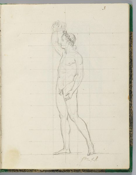 Editor: This is "Gezicht en twee aanzichten van het lichaam van een vijftienjarige jongen," or "Face and two views of the body of a fifteen-year-old boy," by Hieronymus Sperling, created in 1723 using ink and engraving on paper. It feels like a scientific illustration, but the figures have an elegance about them. What strikes you about this piece? Curator: What captures my attention is the echo of classical ideals filtered through the lens of 18th-century thought. These aren’t just studies of proportion, they’re mnemonic devices, reminding us of the classical past and ideas of ideal beauty. Note how the figure on the left recalls antique sculptures, then contrast this with the geometric grids that are trying to rationalise those ideals. Do you see that tension? Editor: I do. It’s like they’re trying to fit the classical form into a mathematical formula. Was this a common approach at the time? Curator: Precisely. This reflects the Enlightenment's quest for order and reason. It's like they believed beauty itself could be quantified and reproduced using these visual keys. This desire reveals both reverence for the past, and the period's own cultural assumptions about the world and humankind's relationship with the universe. It is as much cultural archaeology as anatomical study. Editor: So, it's less about objective measurement and more about the cultural baggage they're bringing to it? Curator: Exactly! It embodies a very specific set of beliefs about aesthetics and knowledge that continue to influence how we understand visual representation, albeit often unconsciously. What resonates for you now that you see this aspect? Editor: I appreciate the layers of meaning now, knowing that the geometric shapes hold symbolic value far beyond scientific interest. Thanks, that's fascinating.
