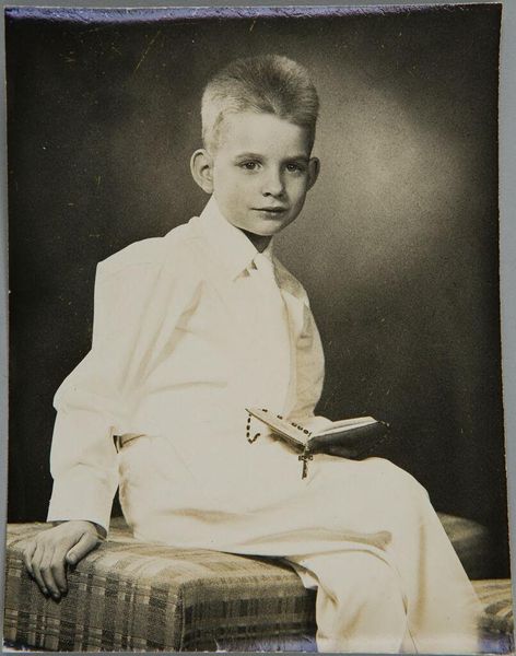 Curator: This is an untitled double studio portrait by Martin Schweig, featuring a boy in a large white collared shirt. Editor: It has an air of melancholy, doesn't it? The muted tones and the boy's steady gaze…it feels poised between innocence and knowing. Curator: Yes, the white collar, almost like a simplified sailor's uniform, evokes ideas of childhood and perhaps a subtle connection to themes of exploration and adventure. But also, conformity. Editor: Precisely! The tight crop focuses us on the face and the stark contrast between the collar and the background creates a strong graphic element. It's a study in light and shadow that almost abstracts the figure. Curator: And think about what studio portraits like this represented. In a way, they were about presenting an ideal self, reinforcing social norms of dress and demeanor. Editor: It's a potent reminder of how photographic portraiture can both reflect and shape identity. Curator: Indeed. Even without knowing the specific date, the visual cues offer a glimpse into a particular moment and its values. Editor: A compelling reminder that the formal aspects of an image are never separate from its cultural context.