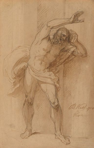 Editor: Here we have Eugène Delacroix’s "Christ on the Cross," a pencil drawing from 1839. It’s a pretty stark image. The quick lines give it a raw, almost unfinished feel. What can you tell me about this work? Curator: This drawing provides an intimate view of Delacroix grappling with power, suffering, and faith. But what power dynamics are truly at play here? Christ's crucifixion has been used to justify various forms of oppression throughout history. How might Delacroix, living in a post-revolutionary France grappling with its own legacies of violence and social inequalities, be interrogating the complex relationship between religious narratives, suffering, and authority? Does the medium, pencil on paper, lend itself to a feeling of immediacy? Editor: It definitely feels immediate, like a snapshot of a deeply personal reflection. The starkness emphasizes the suffering. Curator: Yes, and considering Delacroix's historical context, this image speaks to more than religious piety. It compels us to think about those whose suffering has been historically overlooked. Think about colonialism, poverty... the systematic violence enacted against marginalized communities. Where does "religious" art intersect with the historical realities of power? Is it about offering comfort, or forcing a reckoning? Editor: So, you're saying it's less about glorifying faith and more about questioning power structures that use suffering as a tool? Curator: Exactly. And Delacroix, with his Romantic sensibility, was very interested in pushing back against established norms. How can a piece like this force a re-evaluation of existing conditions, especially around race and gender? It pushes us beyond a simplistic understanding of faith to recognize that images like these carry weight that may perpetuate systems of oppression, no? Editor: That gives me a lot to consider, how artistic representations of faith intersect with real-world social justice issues. Thank you. Curator: My pleasure. It's a reminder that we must always challenge what seems "sacred" when it contributes to injustice.