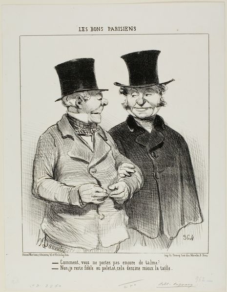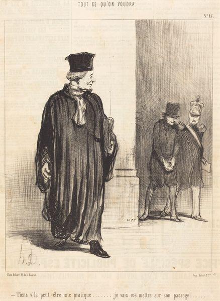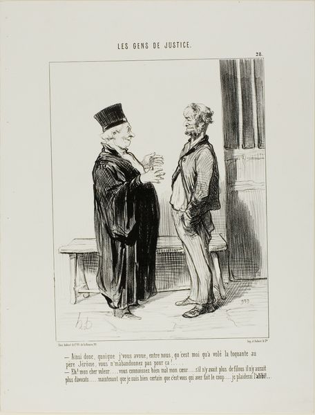 Here is the audio guide script for the artwork provided: Honoré Daumier created this lithograph, “Perdu, monsieur… perdu sur tous les points…”—part of his series, “Les Gens de Justice”—to critique the legal profession. Visually, it presents a stark contrast: a stout lawyer in billowing robes confronts a disheveled client. The lawyer's dark, voluminous attire dominates the composition, its heavy lines suggesting an imposing figure, literally and figuratively weighing down the scene. Daumier employs a semiotic language through contrasting shapes and sizes to convey power dynamics. The lawyer’s exaggerated form, captured with thick, assertive lines, faces off against the client’s comparatively diminutive and weakly defined figure. These formal choices are not merely aesthetic; they function as a critical commentary on the perceived injustices and avarice within the legal system. The print uses line and form to undermine conventional respect for legal authority, suggesting it's a system where justice is a commodity. This challenges fixed meanings of justice and professionalism, critiquing social structures through visual satire.