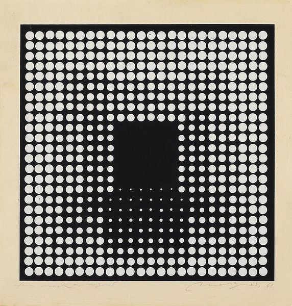 Curator: Ah, "Meride," a print made in 1963 by Victor Vasarely. Instantly recognizable, isn’t it? One of his iconic explorations of Op Art. Editor: My first impression? It's like a meticulously planned maze…or maybe a strange kind of textile pattern seen through a kaleidoscope. There’s a mesmerizing tension. It’s both rigid and feels almost…in motion. Curator: That tension, that sense of movement is crucial. Vasarely's work in the 60s aimed to disrupt static perception, very much reflecting a shifting society. The squares seem to breathe, creating an illusion of depth and dimension, all from a flat surface. Editor: You know, I find the contrast so stark and powerful – that solid black background really makes the intricate white geometric pattern pop. Did Vasarely see his works as accessible to a broad public? Because there’s an immediacy to it, it avoids the often rarified airs of "high art." Curator: Absolutely, he was driven by that concept. Vasarely strived to democratize art. Believing it should be integrated into everyday life. This print medium perfectly embodies that. Prints are multiples; accessible in a way paintings often aren’t. He even envisioned large-scale murals for public spaces derived from these ideas. Editor: Interesting. When you put it in the context of wanting art to be for everyone it brings out how this piece might symbolize order versus chaos. The rigid framework overlaid with this explosive dynamism. Is this perhaps a commentary on society at that time? Curator: You’ve nailed it. The underlying grid offers that structure, yet the superimposed shapes, defying regularity, mirror the revolutionary spirit. And look at the subtle imperfections. The grid isn’t perfect, the lines have varying weights, introducing an organic quality against the machine-like precision. This piece feels so forward-looking but simultaneously reminds us of a handcrafted tradition. Editor: Yes. Now I also see this conversation between control and release, between something man-made and something slightly off-kilter. What a trip. So this relatively simple pattern can hold so many competing themes. Curator: Exactly. This is Vasarely's genius – capturing cultural energies and channeling them into mesmerizing visual experiences.