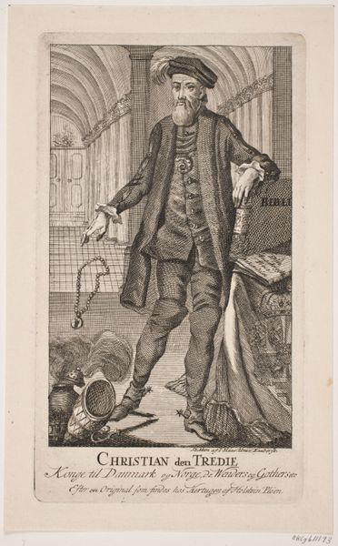 Curator: This is "New Year's Greeting Card," an engraving dating back to 1806 by Joseph Bergler the Younger, currently held at the Metropolitan Museum of Art. Editor: What strikes me immediately is the curious pairing of figures – a young man and a rather stout little dog. There’s a quaint formality to the scene. Curator: Indeed. This print offers us a fascinating glimpse into early 19th-century social customs surrounding New Year greetings. Consider the tradition of genre painting. Editor: The dog is charmingly earnest. It almost reads as an emblem of loyalty, standing next to a sign. Curator: The text on that sign the dog is guarding roughly translates to “Wisher of a Happy New Year.” This reflects a historical shift, doesn't it? Away from overt aristocratic patronage to broader cultural dissemination of such images. Editor: That dog has such soulful eyes. Perhaps it represents domestic virtues, a gentle contrast to any political upheavals of the time. Is the young man intended as the artist? Curator: It's possible. What makes this image relevant to social history is its availability through prints to a larger public—marking the emergence of art as a commodity and the expansion of middle-class values. Editor: The classical urn adds a touch of timelessness—linking a contemporary greeting to broader traditions of artistic patronage. It's fascinating how visual elements weave together like threads of time, inviting one to consider our continuous relation to the past. Curator: Precisely. Images such as these acted as vectors for evolving social structures, giving shape to identity and the new rituals of that period. Editor: Looking at it more closely has certainly enriched my perspective, it is curious to notice how seemingly straightforward scenes like these have much deeper layers of meaning than meet the eye at first glance.