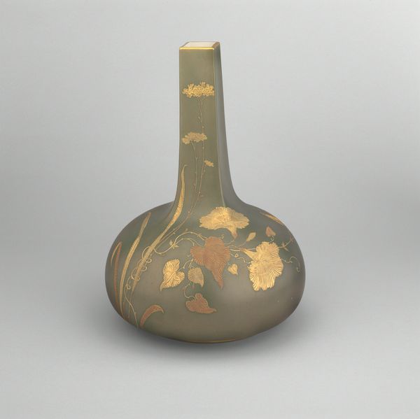 Curator: This vase, created around 1915 by the N.V. Plateelbakkerij Zuid-Holland, exemplifies the Art Nouveau style through its use of earthenware and polychrome decoration. What strikes you about its design? Editor: It's instantly calming, almost melancholic. The muted palette—the subdued purples and rosy pinks against the dark greens—creates a very specific mood. The form, too, is interesting; quite geometric, especially when you consider the organic subject matter. Curator: Precisely. Art Nouveau, despite its organic inspiration, often embraced industrial techniques and, here, the geometric form provides an interesting counterpoint to the floral motif. Plateelbakkerij Zuid-Holland was significant in popularizing Art Nouveau in Dutch ceramics. Editor: And the floral motif itself... It’s not realistic. These aren't botanical studies. They're stylized, flattened, almost decorative symbols of flowers. Notice how the stem wraps almost uniformly up the vase and blooms near the opening. The artist is exploring forms within a limited plane. Curator: Right. These decorative arts served a crucial function in democratizing access to art. Affordable and mass-produced, ceramics such as these brought artistic expression into everyday life for the Dutch middle class. How would its setting have shaped the vases appeal to patrons? Editor: A point well-taken. By emphasizing this aestheticism, artists turned common items into conversation pieces that reflected the owners taste. Curator: Yes, they mirrored an increasing sense of nation and refinement. And considering the socio-political context of the era with looming WWI this piece may reflect a longing for a time of renewal and organic beauty in the face of industrialized warfare. Editor: Interesting consideration. Reflecting back on our points about material and formal technique, the interplay of somber tones with floral representations created something to value outside all these concerns. Curator: Absolutely, whether a commentary or refuge of thought, the artist of this earthenware created something intriguing to enjoy reflecting upon within and beyond their immediate setting.