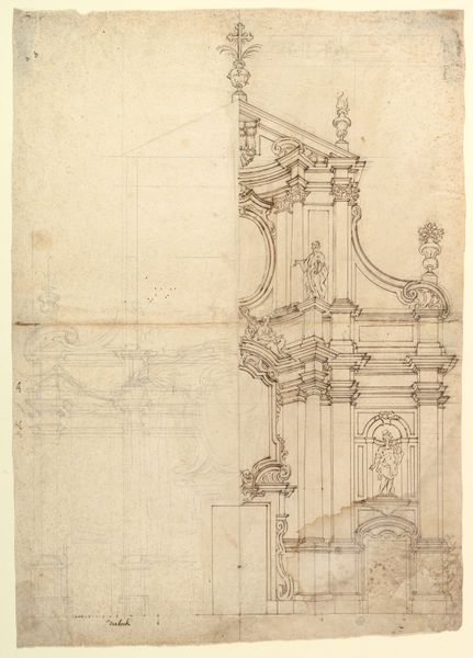 Lorenz Frølich created "Udkast til dueslag" with graphite on paper. The sheet presents multiple iterations of a dovecote, each a study in architectural form and spatial arrangement. Frølich explores verticality and structure through varied designs. We see towers supported by slender arches or sturdy posts, capped with ornate roofs or simple platforms. The repetitive nature of the sketches invites us to examine the subtle variations in line quality, from tentative and exploratory to firm and decisive. This contrast embodies a tension between the conceptual and the concrete. These dovecotes transcend mere function; they symbolize a desire to create order and shelter. The composition, a seemingly casual arrangement of forms, hints at a deeper dialogue between utility and artistic expression. Note how the precision of the architectural details juxtaposes the ephemeral quality of the graphite lines. This contrast underscores the transient nature of the creative process itself, where ideas are constantly refined and reimagined.