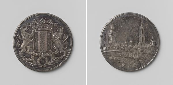 Curator: This is the Vroedschapspenning of the city of 's-Hertogenbosch, dating from 1714 to 1720. It’s a medal, likely crafted from silver or a similar metal, and created by Theodorus Casparus van Berckel. Editor: My first impression is of a miniature world, pressed into being. It’s striking how the artist has managed to convey so much detail within such a limited space, wouldn’t you agree? Curator: Absolutely. And the very nature of a coin – a medium of exchange, of power, really – transforms these cityscapes and symbolic figures into commodities, signs of municipal identity circulated amongst its elite. Editor: Tell me more about the depictions themselves. The building on one side seems particularly grand. Curator: On one side, we see a detailed depiction of the Stadhuis, the city hall, while the other side showcases the city skyline itself. These weren’t merely aesthetic choices. They were about reinforcing the authority and image of 's-Hertogenbosch, weren't they? Highlighting its architectural achievements as visual testaments to its civic strength and importance. Editor: Yes, it strikes me how these buildings are presented almost as fortifications of political power. I'm thinking of the skilled artisan work; the crafting processes speak volumes about 18th-century metalworking, each strike, each indentation is the exercise of labor manifested to reflect political order. Curator: Exactly. And it's fascinating to consider the medal's materiality. Think of the specific techniques needed to create this level of detail in relief, which involves an enormous amount of careful and intentional labor. It also says a great deal about the value the elites of the time would attach to their civic role within the city. Editor: And of course, we must acknowledge its symbolic function. This was not just about depicting buildings and skylines, but communicating power, legitimacy, and the city’s unique character to both internal and external audiences, and even serving as gifts between nobles. Curator: Precisely. It makes one think of who would hold this, who would touch it. The sensorial engagement connects users intimately to a sense of civic pride. It is as much about that feeling, that physical link to this imagery, as it is a pure symbolic representation. Editor: It gives a unique snapshot of artistic skills and values embedded in social and political conditions of the 18th century. A coin reflecting far more than currency. Curator: Agreed. It gives a window into the priorities and artistic culture during that time.