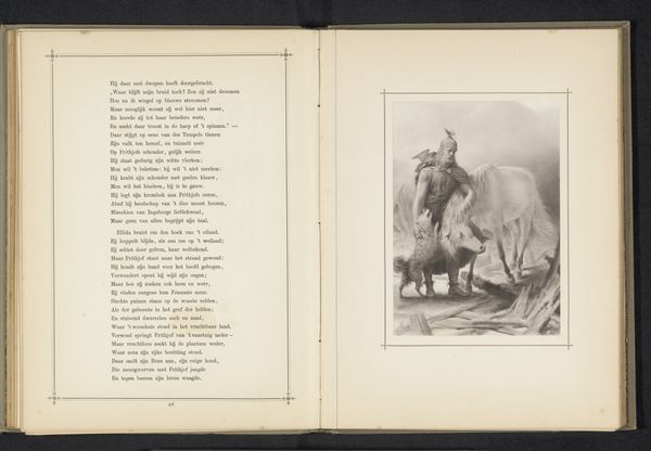 Curator: Here we have a photo reproduction of a painting depicting a scene from “Der Trompeter von Säkkingen,” dating back to before 1890. It shows a trumpeter and his horse. Editor: Immediately I'm struck by its melancholic mood. The grainy, almost ghostly quality of the photograph emphasizes the separation, a poignant farewell scene rendered in sepia tones. It evokes nostalgia. Curator: Indeed. The subject of the original artwork draws on German Romanticism and celebrates loyalty, adventure, and even hints at social hierarchies through its clear class-based depiction of military service. Editor: It’s worth noting how these representations of the idealized soldier, often presented as noble and self-sacrificing, reinforce and perpetuate certain societal power structures, specifically normalizing militarization. Who exactly is the heroic narrative serving, and whose experiences are erased? Curator: That’s a crucial consideration. The medium of the artwork is also telling: A reproduction. This points to how cultural images, narratives surrounding duty, loss, honor, and patriotism are diffused and replicated to serve as a model for collective understanding, further cementing ideological structures. Editor: It prompts us to think about the transmission of ideas, the ways in which photographic reproduction shapes how stories are remembered and re-presented. In doing so, it raises the important question of the image's role in broader cultural identity and even propaganda. Curator: Precisely. A print in an era of evolving technologies for disseminating narratives around German nationalism, making visual access broader. It really underscores the complex role of art. Editor: It reminds us to view historical imagery not as neutral reflections, but as documents deeply entangled with power. Understanding that helps us critique the present. Curator: Absolutely, it’s about understanding the social and political landscapes where the images emerge, circulate, and impact social and historical understanding. Editor: Definitely gives me something to think about.