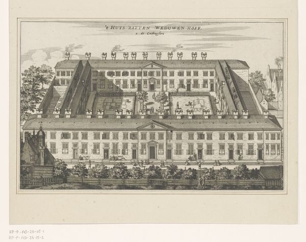 Curator: Israel Silvestre produced this etching in 1655. Titled "Gezicht op het Palais du Luxembourg," it offers a fascinating glimpse into the architecture and social landscape of the period. Editor: It feels…formal, rigid, even. The severe symmetry, those sharply defined lines of the etching. It’s a very controlled and controlled kind of beauty. Curator: That's characteristic of Baroque sensibilities. We see this aristocratic ideal reflected, not just in the palace architecture, but also in the very meticulous arrangement of the gardens. Consider the function of the Luxembourg Palace as a seat of power and how Silvestre’s rendering supports that image. Editor: Yes, power is certainly communicated! The sharp perspectival view—centered on the main structure—lends a theatrical feel. It's less a document and more a performance of dominance and order. Curator: This reminds us that visual representations played a crucial role in solidifying power. Etchings like this, circulated widely, served as visual propaganda, projecting an image of sophistication and stability to both domestic and international audiences. Note, too, the small figures included within the grounds: they reinforce the scale of the building while underscoring an impression of vibrant, fashionable public life. Editor: Though tiny, these figures—they introduce a counterpoint. Their leisurely activities soften the stark geometry of the palace and gardens, which mitigates the otherwise potentially imposing effect. The palace would feel like an absolute monolith without them. Curator: Precisely! Silvestre was astute in crafting a balanced view—displaying grandeur while suggesting an accessible elegance. And the prints themselves become tools for disseminating these powerful social ideas to an ever wider public. Editor: Looking closely, it seems a balance has been sought out in the work’s tonal range also. I wouldn't call this merely informational! The engraver's skills have crafted more than a flat record; here’s depth of visual texture adding considerable atmospheric qualities and depth, beyond simple data recording of location. Curator: A good observation. What begins as documentation transforms through artistry into so much more: these pieces shape understanding and social attitudes. Editor: I came to understand this work initially in aesthetic terms, though I concede your point that beyond aesthetic decisions, the politics here are pretty hard to overlook. Curator: And to me, analyzing those politics, without observing Silvestre's artistry feels somehow inadequate! It really comes down to complementary approaches when engaging with any artwork.